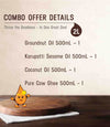 Answer: It contains four essentials – Cold Pressed Groundnut Oil, Cold Pressed Karupatti Sesame Oil, Cold Pressed Coconut Oil, and Cold Pressed Pure Cow Ghee.